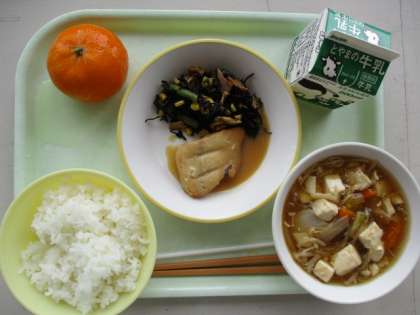 今日の献立は、鰆の西京焼き、ひじきのソテー、豆腐の野菜あんかけ、ご飯、牛乳、冷凍ミカンです。