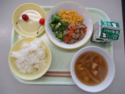 今日の献立は、豚そぼろ、炒り卵、ゆでブロッコリー、豆腐スープ、ご飯、牛乳、サクランボです。