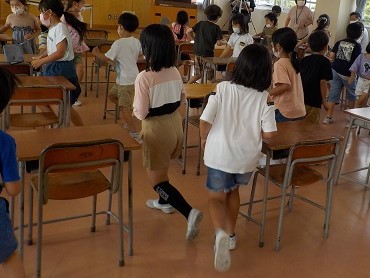 子供たちは2拍子や3拍子に合う動きを考えて、みんなで一緒に動いて表現することを楽しんでいました。