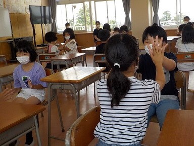音楽科の学習で、体を動かしたり手拍子したりしながら曲を聴きました。