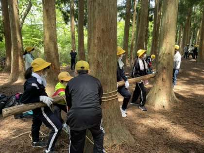 森小屋作りが始まりました。「自分達の基地でお昼ご飯を食べるぞ!」と、どの班も張り切っています。