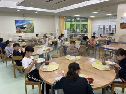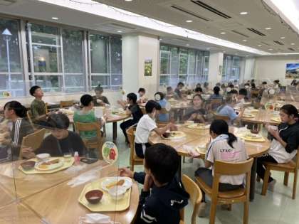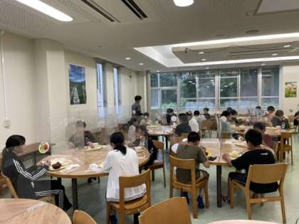 おいしい夕食をお腹いっぱい食べました。雨天のため、夜の活動は室内でのキャンドルサービスになります。