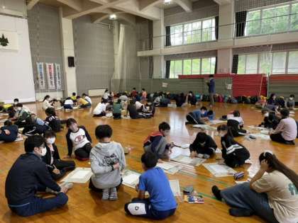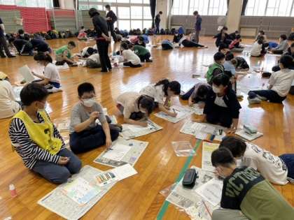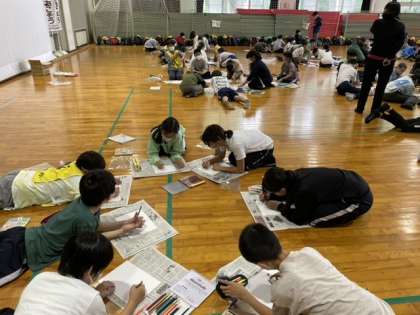 午後は、宿泊学習の思い出を色紙に表しました。この二日間で心に残ったことを友達と語り合いながら、絵や俳句、短歌、詩などにしました。