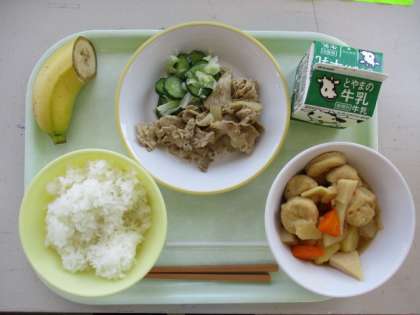 今日の献立は、豚肉のジャンロー、刻み和え、炊き合わせ、ご飯、牛乳、バナナです。