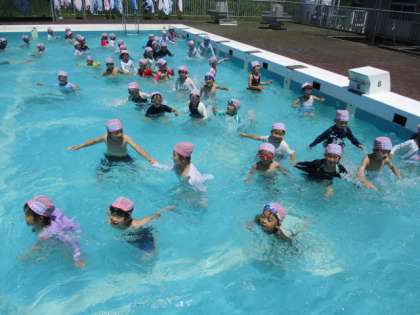 今日は、初めてのプール学習がありました。子供たちは、今日のプール学習を楽しみにしており、朝から「早くプールに入りたいな」「昨日、お風呂で練習してきたよ」と話していました。