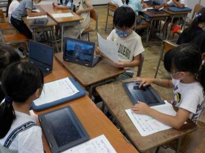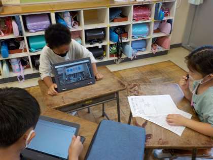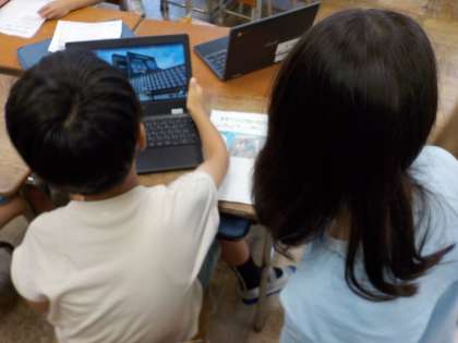 新庄のすてきについて、調べてきたことを話し合いました。書いてきた文と絵では伝わりきらないところは、インターネットを利用して補足しながら説明していました。