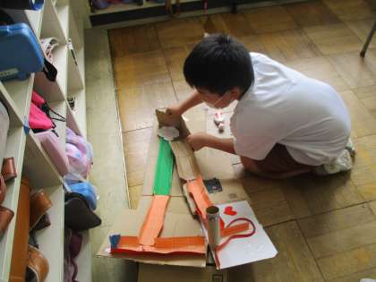 ビー玉を転がして遊ぶ迷路おもちゃ作りを行っています。いろいろなアイディアが溢れ、どのコースも完成が楽しみです。