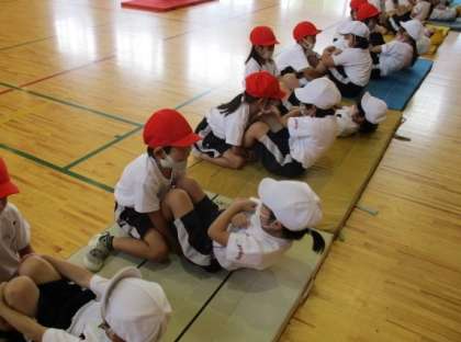 今日は、体力テストの上体起こしと反復横跳びの練習をしました。子供たちは初めて取り組みましたが、どちらも上手にできていました。