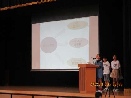 広報委員会の代表児童からは、「この新庄小マスコットキャラクターを今後、委員会や各学級で積極的に使用し、新庄小学校をよりよい学校にしていきましょう」と話がありました。
