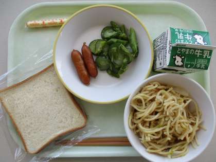 今日の献立は、粗挽きウインナー、アスパラサラダ、ツナとキャベツのスパゲッティ、棒チーズ、食パン、牛乳です。