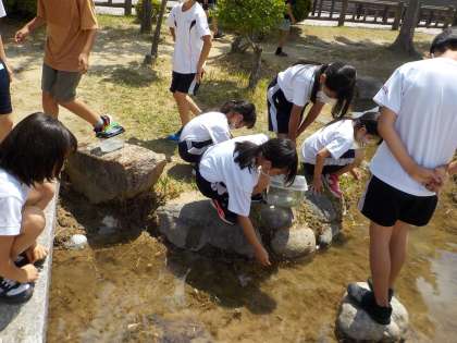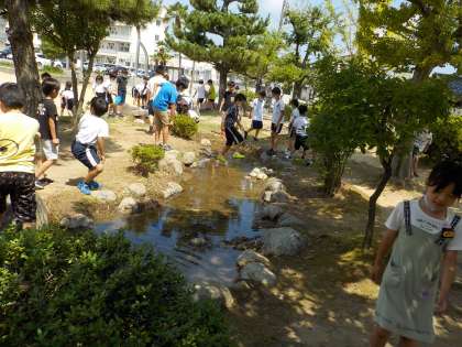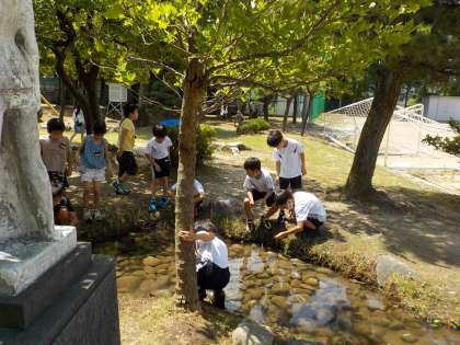 「新庄の森には何種類のタニシがいるのかな」「ヤゴはいないかな」「カナブンのすみかがある木があるよ」「この木からクワガタが落ちてきたよ」休み時間になると、子供たちは地域の方が整備してくださった新庄の森に集まります。自然とのふれあいを通して、異学年との友達の輪が広がっています。