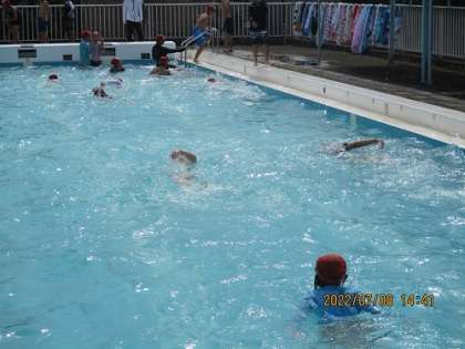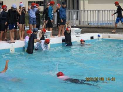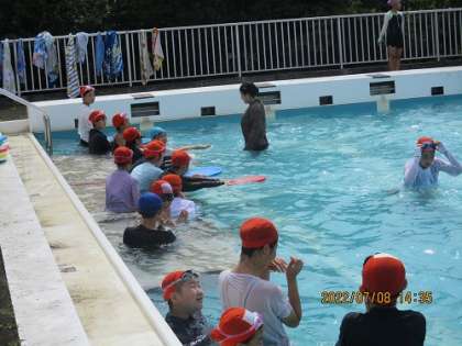 今日も、グループに分かれて水泳学習をしました。前回よりも、長い距離を泳げるようになったり、力強くバタ足ができるようになったりする子供たちが増えました。よい天気の中、とても気持ちよく泳いでいました。