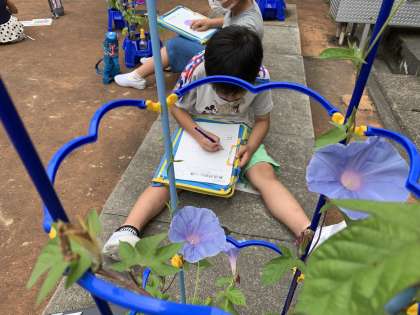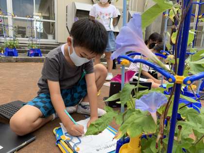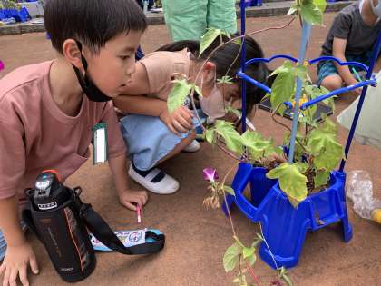 きれいに咲いたアサガオに、子供たちは大喜びです。見るだけでなく手触りや臭い等、五感を使ってじっくりと観察していました。