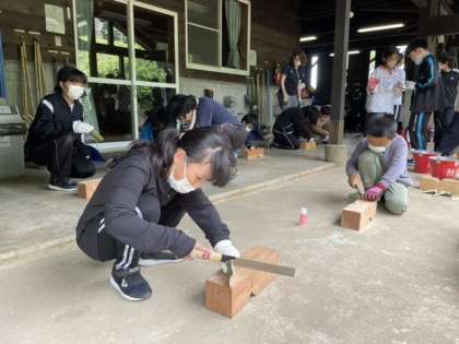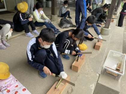 のこぎりで竹に切れ目を入れているところです。みんな真剣な表情です。