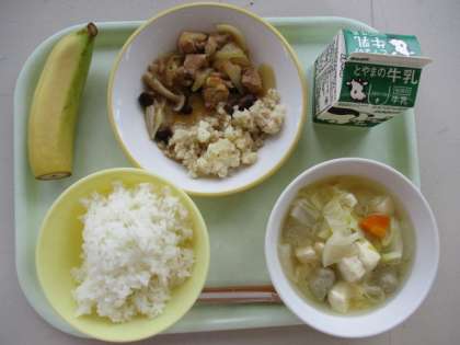 今日の献立は、あっさりチキン、胡麻ポテト、つみれ汁、ご飯、牛乳、バナナです。