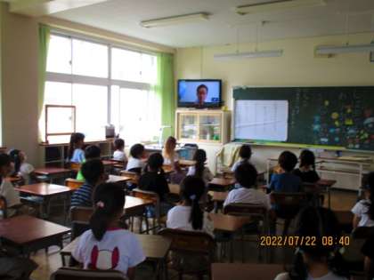 新型コロナの感染症対策としてリモート形式での終業式となりましたが、児童たちは校長先生からの夏休みの過ごし方の話に熱心に耳を傾けていました。