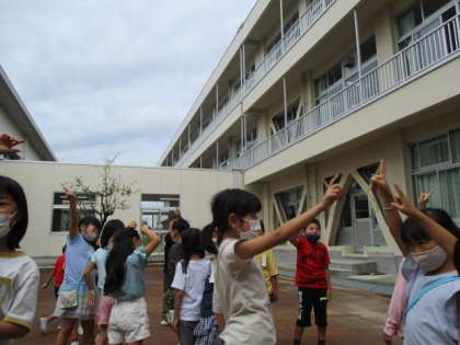 2学期最初の国語の授業風景です。「いちねんせいのうた」では「あおいそらのこくばんになにかこう」という文や漢字の「一」から実際に外に出て「一」を書いてみました。授業後には教室の中や空を見て「一があったよ」と一探しをしていました。