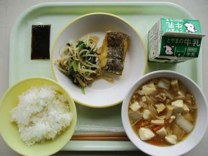 今日の献立は、ホキの米粉揚げ、こうみ和え、豆腐の野菜あんかけ、のりの佃煮、ご飯、牛乳です。