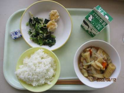 今日の献立は、にんじんシューマイ、小松菜浸し、八宝菜、ポケットチーズ、ご飯、牛乳です。