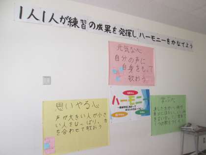 5年生は、音楽会・学習発表会に向けて練習に取り組んでいます。代表の子供たちが、5年生一人一人の思いをまとめ、スローガンを決めました。このスローガンのもと、本番に向けて頑張っていきます。