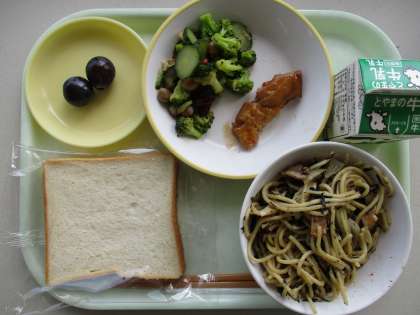 今日の献立は、照り焼きチキン、ビーンズサラダ、ベーコンとひじきの和風スパゲッティ、巨峰、食パン、牛乳です。
