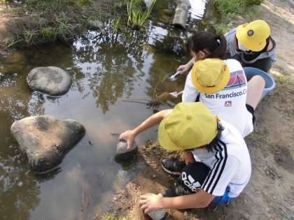 今日の朝、新庄の森に植えた水中植物が倒れていて、十分に育っていないことに気が付いた人たちが集まって、砂を入れたり石で周りを囲んだりしていました。