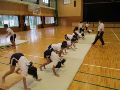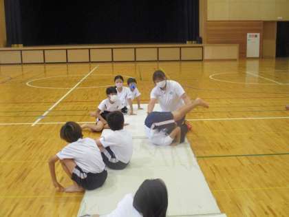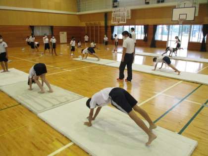1限〜4限まで、各クラスに分かれてマット教室を行いました。マット運動の基礎となるクマ歩きから始まり、前転・後転・側転が上達するポイントを丁寧に分かりやすく教えていただきました。学習発表会で披露する予定なので、今後練習を重ねてもっと美しい技にしていってくれればと思います。