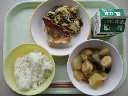 今日の献立は、赤魚の塩焼き、卵ときくらげの炒めもの、炊き合わせ、ご飯、牛乳です。