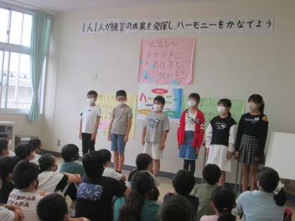 5時間目に学年集会をしました。子供たちが考えたスローガンや思いを全体で確認し、一人一人がどのような姿になりたいかゴールまでの見通しをもちました。6時間目には、酒井先生に合唱指導をしていただきました。声の出し方、姿勢、2曲の歌を歌うときに気を付けるポイント等、子供たちは、たくさん学ぶことができました。