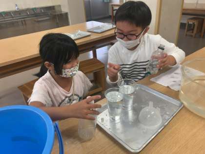 2つの異なる形のペットボトルに入った水の量を比べるためには、どうしたらよいのか。子供たちは、実際にペットボトルを操作しながら考えています。様々な比べ方が出てきて、とても面白いです。