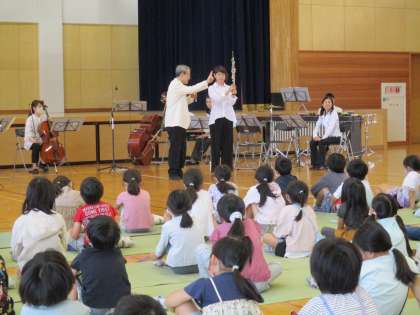 演奏会は、下学年と上学年の2ステージに分けて行われました。オーケストラに登場する管楽器や弦楽器、打楽器の説明を、それぞれの楽器の音色の特徴が分かりやすい曲の演奏で紹介してくださいました。