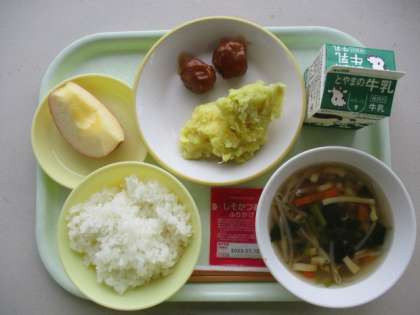 今日の献立は、ミートボール、チーズおさつ、春雨スープ、ご飯、牛乳、しそ鰹ふりかけ、りんごです。