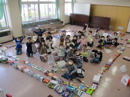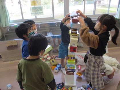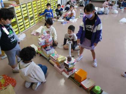 空き箱を使ってタワーや電車等、いろいろなものをつくる活動を楽しみました。どの箱を使ったら高く積み上がるか、電車の車輪はどの形にすればよいかなど、箱の形を考えながら活動しました。
