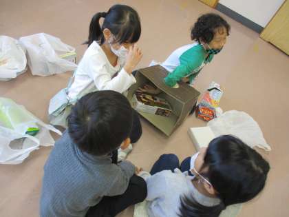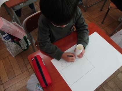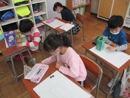 空き箱の形を当てたり、空き箱の形を写し取って絵を描いたりしました。子供たちは楽しみながら、箱の形の特徴を捉えていました。