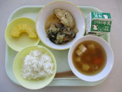 今日の献立は、鯖の塩焼き、しらたきのピリ辛炒め、白玉汁、ご飯、牛乳、パインアップルです。