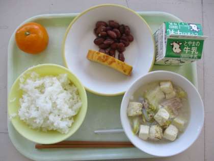 今日の献立は、厚焼き卵、煮豆、塩麹鍋、ご飯、牛乳、みかんです。