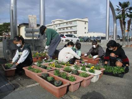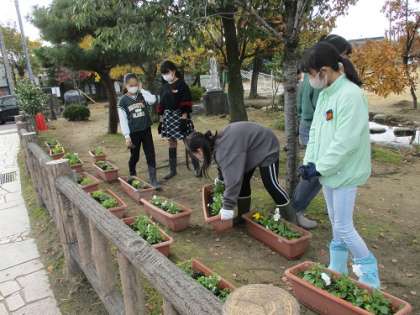 「新庄の森を明るくしたい」「花を増やしたい」という6年生の思いから、プランターに花を植え、新庄の森に配置しました。歩道からも花が見えます。たくさんの人に新庄の森に来て、花を楽しんでもらいたいと思います。