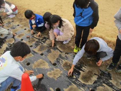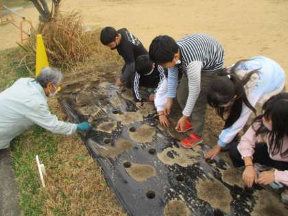 グラウンドの横にある花壇に、チューリップの球根を植えました。春の時に引き続き、グリーンキーパーさんにご協力いただき、300個以上の球根を植えました。入学式の頃に美しく咲く様子を想像しながら心をこめて植えている子供たちでした。