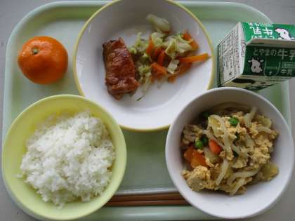 今日の献立は、照り焼きチキン、野菜ソテー、卵とじ、ご飯、牛乳、みかんです。