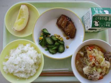 今日の献立は、あじのみりん焼き、コーン和え、豚肉と野菜の甘辛煮、ご飯、牛乳、りんごです。