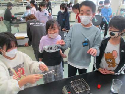 理科の学習で、今日は水と金属の体積が変化するかについて実験を行いました。金属の実験では、カセットコンロの火で熱した鉄球が、熱する前には通過していた輪を通過できなくなった様子を見て、とても驚く様子が見られました。