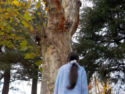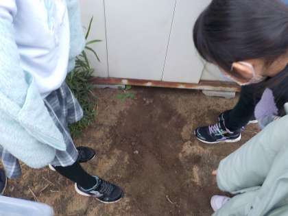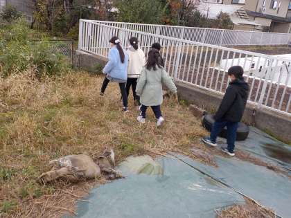「生き物が全然いない。寒くなったから冬眠したのかな」「クモの卵を見つけたよ。こうやって冬をこすのかな」「木にも卵みたいな白色と茶色のものがついているよ。でも、よく見たらキノコかカビかもしれないね」」と、生き物と自然の様子を観察し、季節による変化を感じていました。