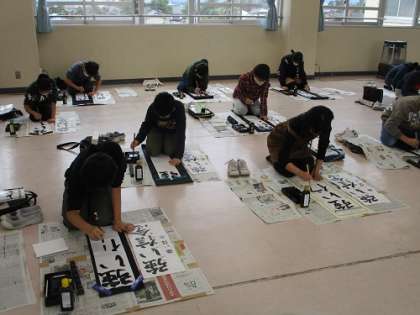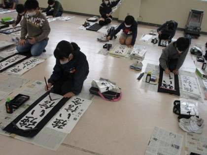 6年生の書き初めの言葉は「強い信念」です。中学校進学に向けて、どんな「強い信念」をもつか考えながら練習しています。