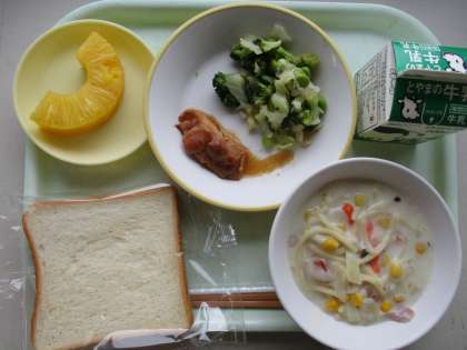 今日の献立は、照り焼きチキン、枝豆サラダ、クリームスパゲッティ、食パン、牛乳、パインアップルです。