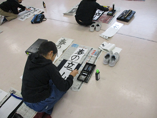 本番に近い形態で、書き初めの練習を行っています。ひらがなと漢字が両方使われているテーマになっているため、筆の入り具合や曲がり等、今までの書写で練習してきた経験を活かして書き進めていました。