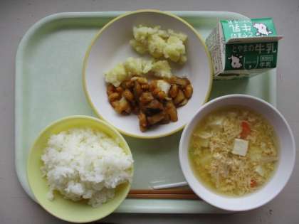 今日の献立は、魚と大豆のねぎソースからめ、粉ふきいも、かき玉汁、ご飯、牛乳です。