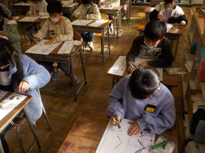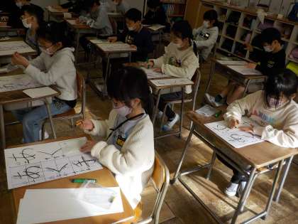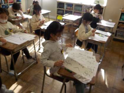 3学期の書き初め大会に向けて、字の太さや濃さに気を付けて練習をしました。お手本をよく見て、力と心を込めて書いた子供たちです。