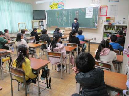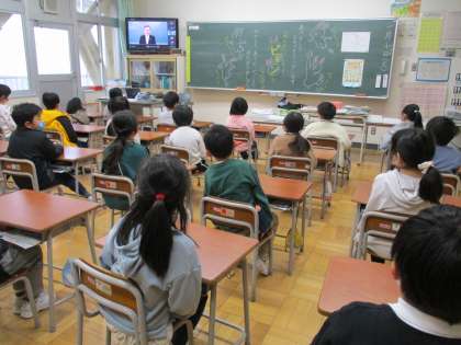 今日から3学期が始まりました。教室には子供たちの元気な声が響き、久しぶりに顔を合わせた友達に冬休み中の出来事を楽しそうに話す姿が見られました。始業式はオンライン形式で行われ、子供たちはモニター越しの校長先生の話に真剣に耳を傾けていました。