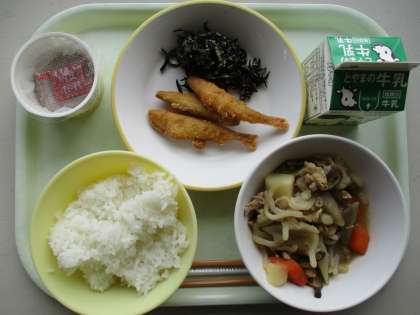 今日の献立は、ひじきのごま和え、わかさぎのフリッター、豚肉の南蛮煮、納豆、ご飯、牛乳です。