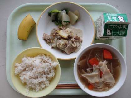 今日の献立は、塩だれ豚どん、かぶの色どり、ワンタンスープ、麦ご飯、牛乳、バナナです。